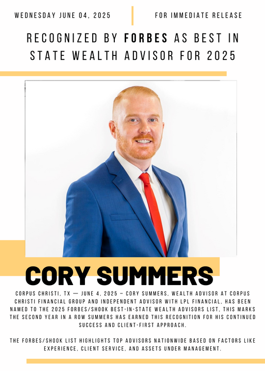 Cory Summers, Wealth Advisor at Corpus Christi Financial Group and independent LPL Financial advisor, has once again been named to the Forbes/SHOOK 2025 Best-in-State Wealth Advisors list. This marks the second consecutive year that Summers has received this prestigious recognition, highlighting his continued dedication to delivering outstanding financial guidance and client-focused service. The Forbes/SHOOK list honors top-performing financial advisors across the country who demonstrate excellence in their profession. Advisors are selected based on a combination of qualitative and quantitative factors, including personal interviews, assets under management, compliance records, and years of experience.